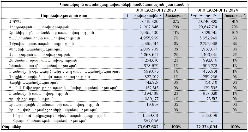 Ներկայացնում ենք ապահովագրական շուկայի կուտակային ապահովագրավճարների համեմատությունը նախորդ տարվա նույն ժամանակահատվածի հետ (2024թ․ և 2023թ․ 4-րդ եռամսյակ)․